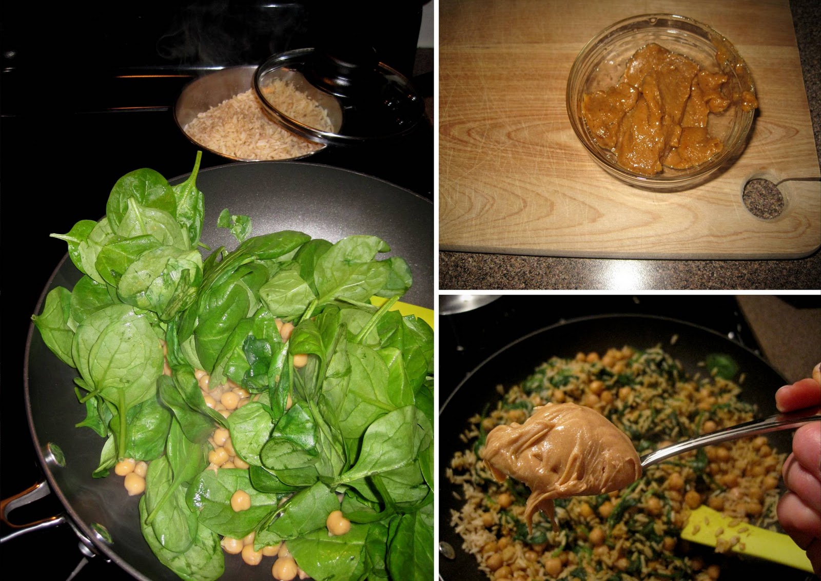 2. When the rice is almost ready, saute the spinach (I used 4 big handfuls) and chickpeas (1 can) in a wok