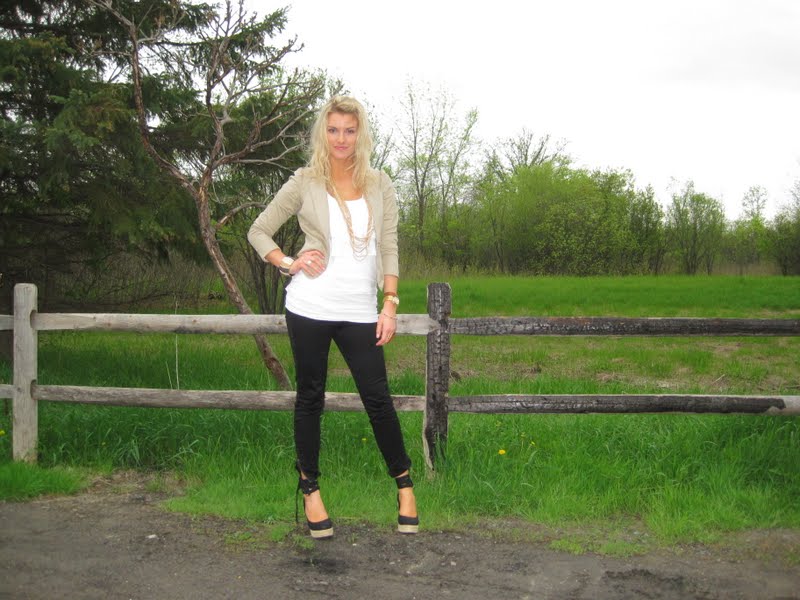 H&M blazer (last seen here), Stitches top (last seen here), H&M tank, Forever 21 pants (last seen here), Aldo wedges, Le Chateau necklace, Bijoux Terner bangle, Swatch watch, Swarovski bangle, Ardene leather bracelet & Charlotte Russe ring