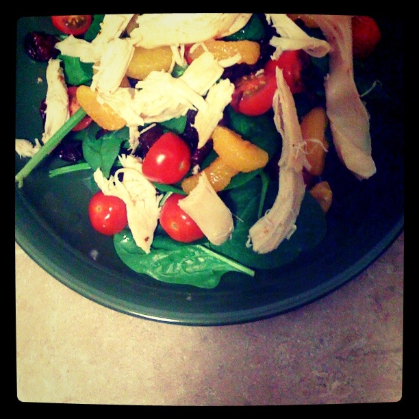 I was leaving Zumba tonight and hit up the grocery store as I needed two things: (i) groceries, and (ii) dinner. After picking up various produce and planning my meal for tomorrow night (I’m making a Greek chicken crock pot dish I’ve never attempted before) I started to feel hungry. I hit up the magazine/cookbook aisle for inspiration and I didn’t even need to open a book! I saw a magazine entitled, ‘Clean Eating’ and my mind jumped to this salad and back to the produce aisle I went. Within 15 minutes of arriving home I was chowing down.