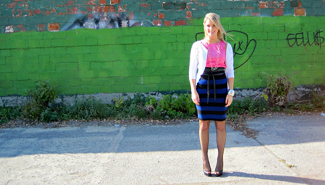 Gap jacket (last seen here), Grace Elements top, Urban Behaviour sweater (cut in half to be a cardigan, last seen here), Forever 21 skirt, Guess heels (last seen here), Givenchy tights, Suzy belt & necklace, Club Monaco scarf, Dollarama sunnies & Auslini bangle