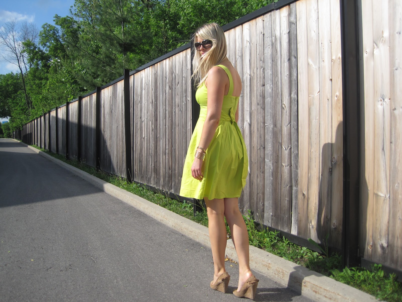 * Trixxi dress from Ross. So I picked up this little number in Florida last year and it was a deep, bright sunny yellow. I, at the time, was on a wash-my-new-clothes-before-wearing-them kick and tossed this in the wash when I got back home before I ever wore it. Pulled it out 40 minutes later and I had a neon lime-ish coloured dress. Wah wah. I ended up letting it sit in my closet for the past year until (hoorah!) this year where neon is super in and I feel really excited (and ‘ready’) to wear it. I tried to wear it last week only to discover the hemline felt too short for work so on Wednesday night I finally let the hem down (it was about two inches) and then finished the edge et voila!