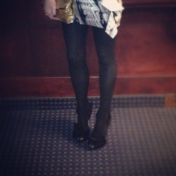 Outfit deets: Jessica Simpson dress, J.Crew bubble necklace, unknown tights, Liliana heels & vintage (thrifted) clutch.