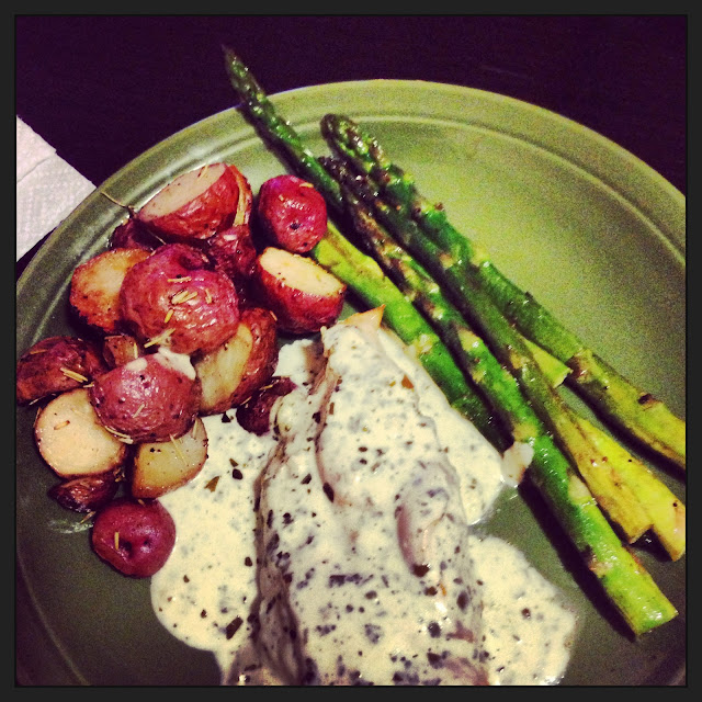 Stuffed chicken–feta, cheddar, basil & pesto–with a basil-cream sauce, asparagus and roasted potatos.