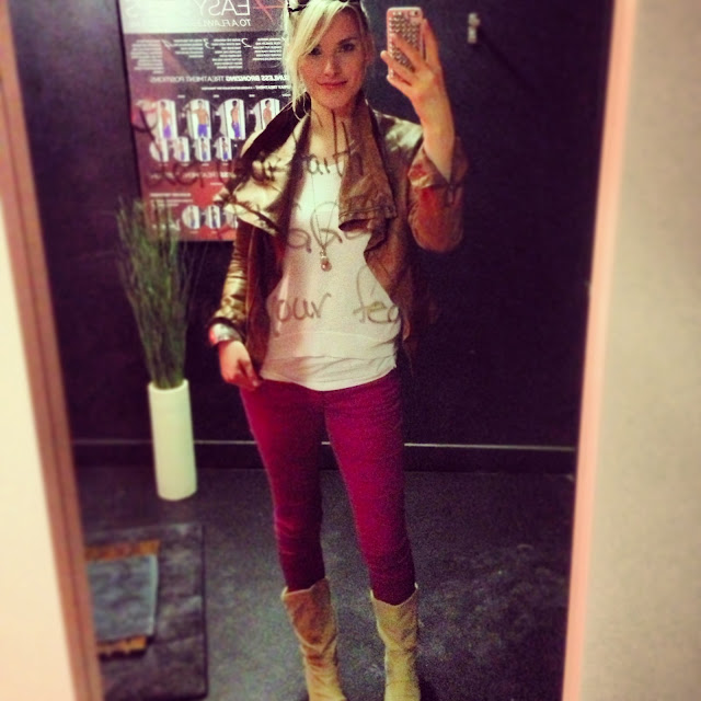 Outfit deets: Dynamite jacket, Max Studio light-knit sweater, Garage tank underneath, Mossimo pants & Aldo wedge boots.