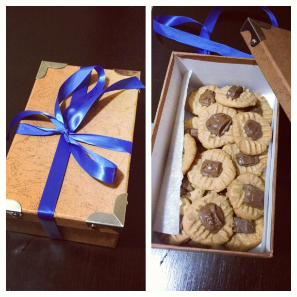 My dinner guests brought a sweet surprise: peanut butter cookies with chocolate stamped centres.