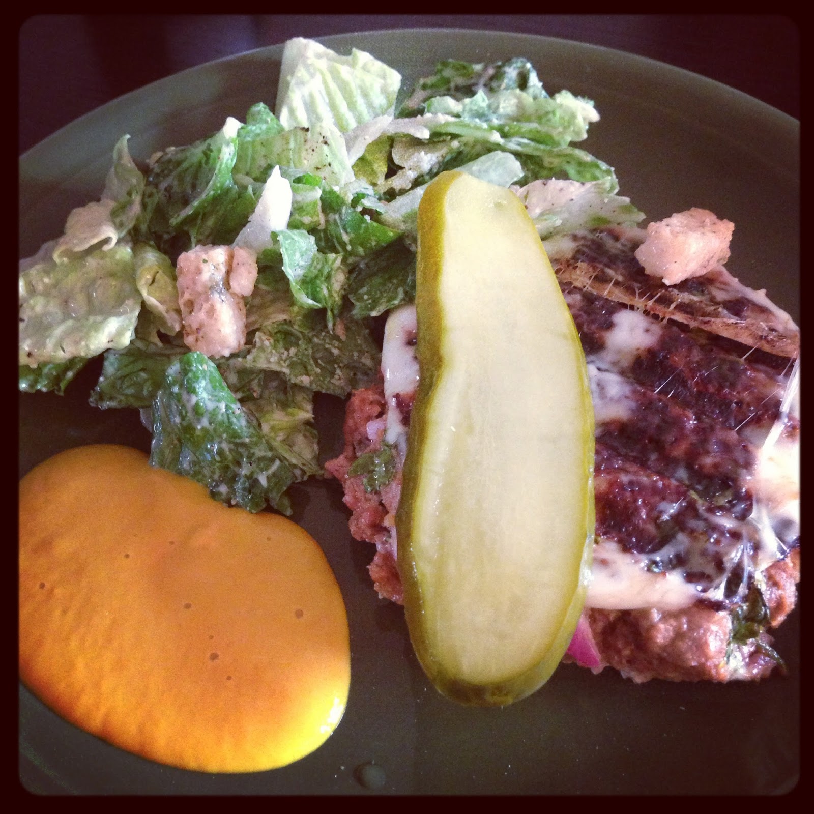 Home-made burgers (gluten free) with non-home-made caesar salad (and lots of mustard!).