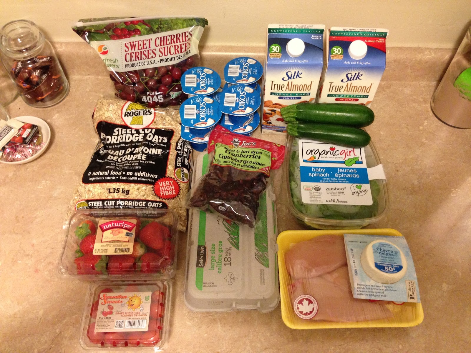 I typically do one larger grocery shop per week, but tend to hit the store a few times within the week to grab more unique foods that are required for a certain dish or meal I’m planning. I always keep fruit, yoghurt, eggs and some sort of salad mix on hand. I frequently eat salad for lunch during the week and usually add some form of protein–hard boiled eggs, chicken or tuna–if I can. My favourite salads contain fruit–some sort of berry or pears–avocado and nuts (if I have them on hand, which I generally don’t). Most often I make a mix of avocado, grape tomatos & spinach.