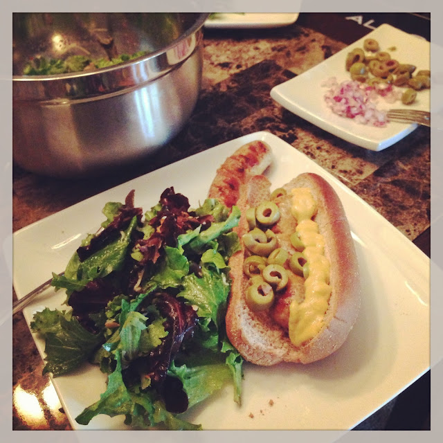 Saturday night dinner: sausages & salae (one splurgy bun for me!).