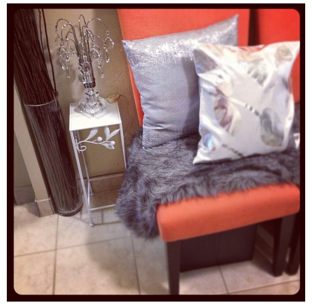 The boots are from Aldo and a couple years old and they are actually on display in my bedroom, but the colours worked to share it beside the living room furniture.