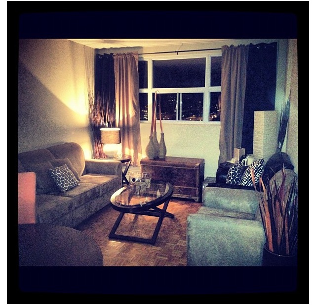 Across from the chair–and another chair in leather that’s beside it, which you didn’t see–is my couch and another end table. The lamp is a recent purchase which I fell in love with as soon as I saw it last Spring. I scooped it up for $40 at Home Sense and it works perfectly in the space.
