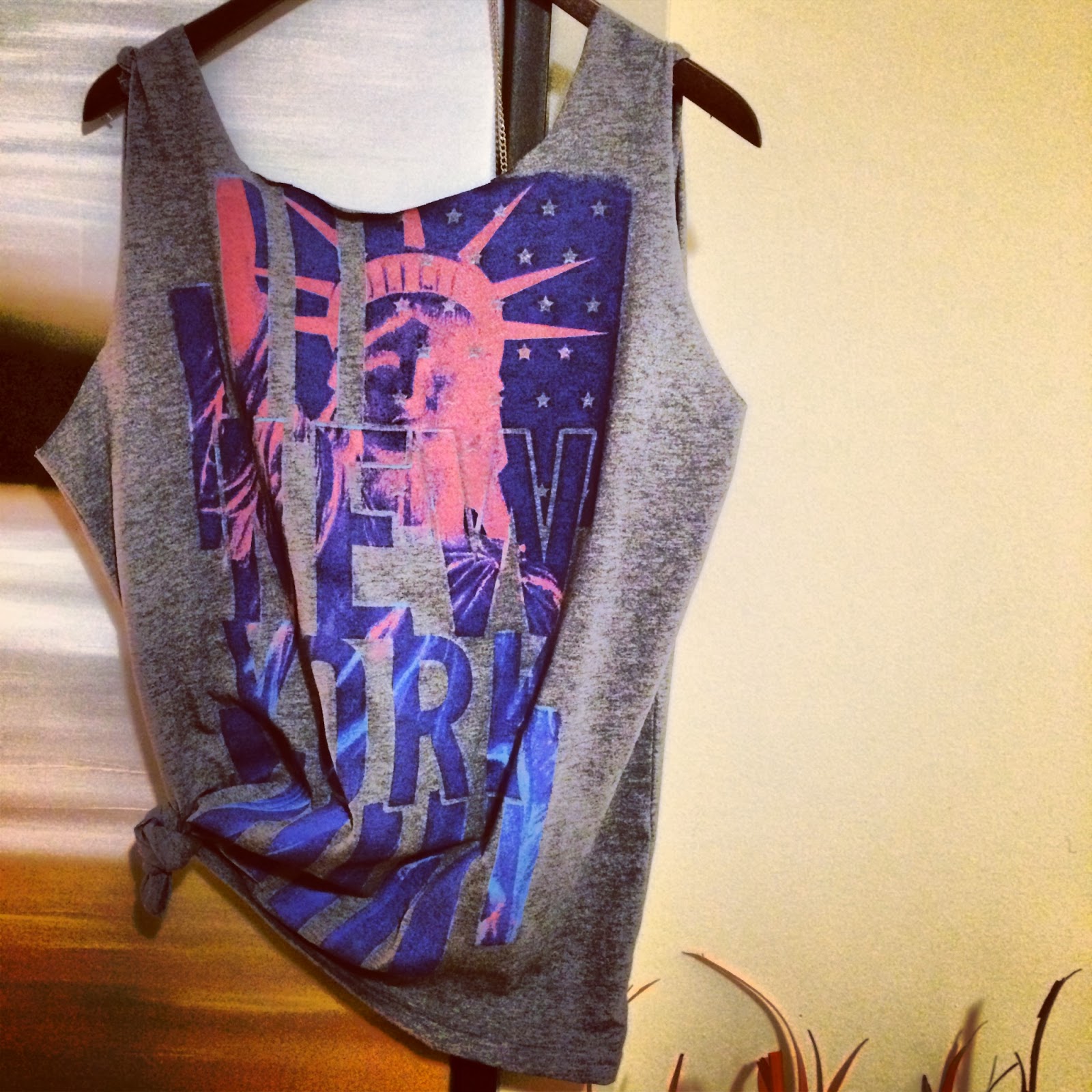 I picked up this New York tee from Walmart, in the men’s section for $7, and cut out the neckline and took off the sleeves. I will probably cut the hem aysemmetrically and wear this to the gym–I made it scoop low in the back–or under a blazer as a cool graphic tee.