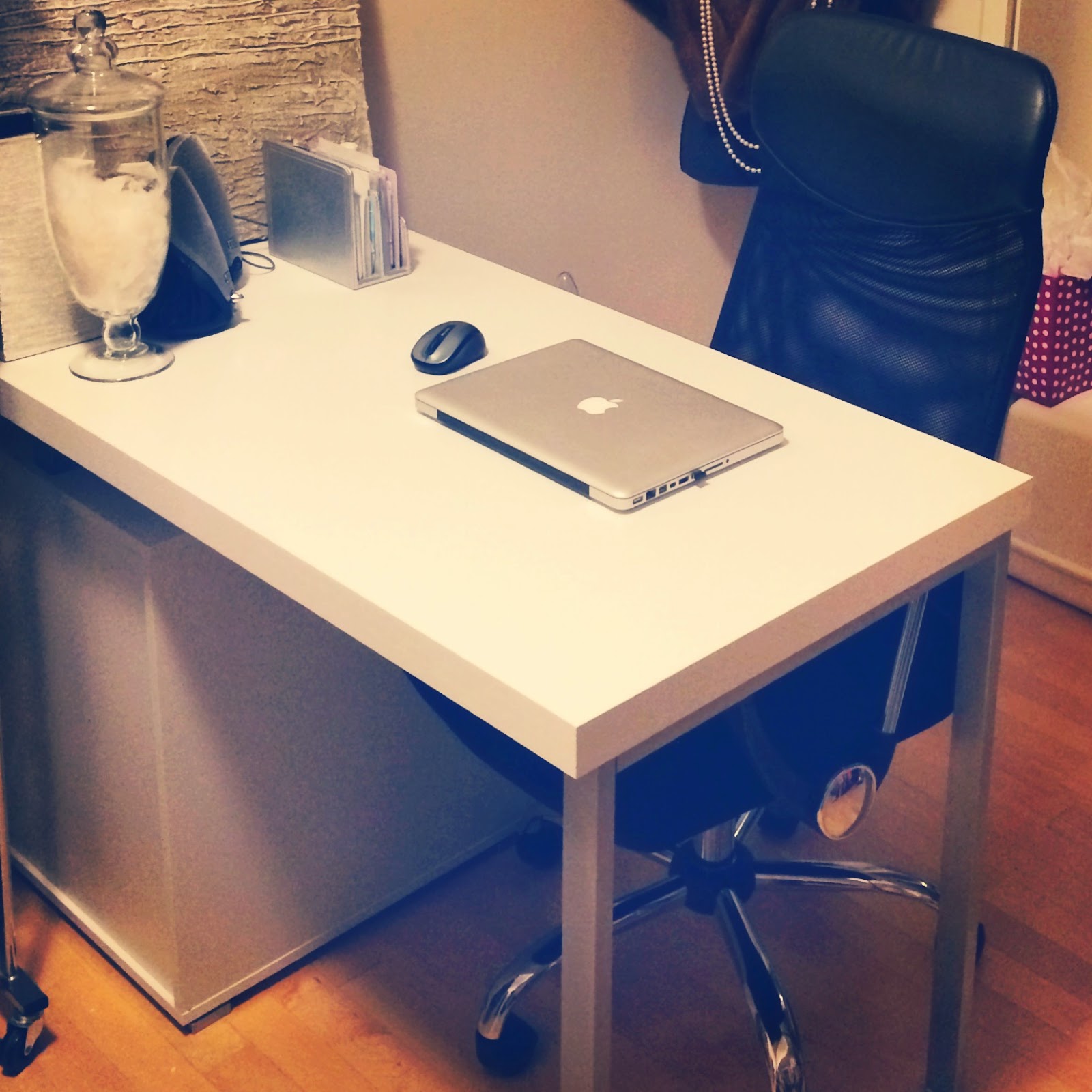 I ordered this desk online from Future Shop–on sale–after swooning over . They are identical in size, shape and structure, the difference is the matte (mine) versus veneered shine. I’m slightly disappointed mine isn’t shiny as I didn’t realize that was the case, but for $200 less, I’ll take the matte finish.