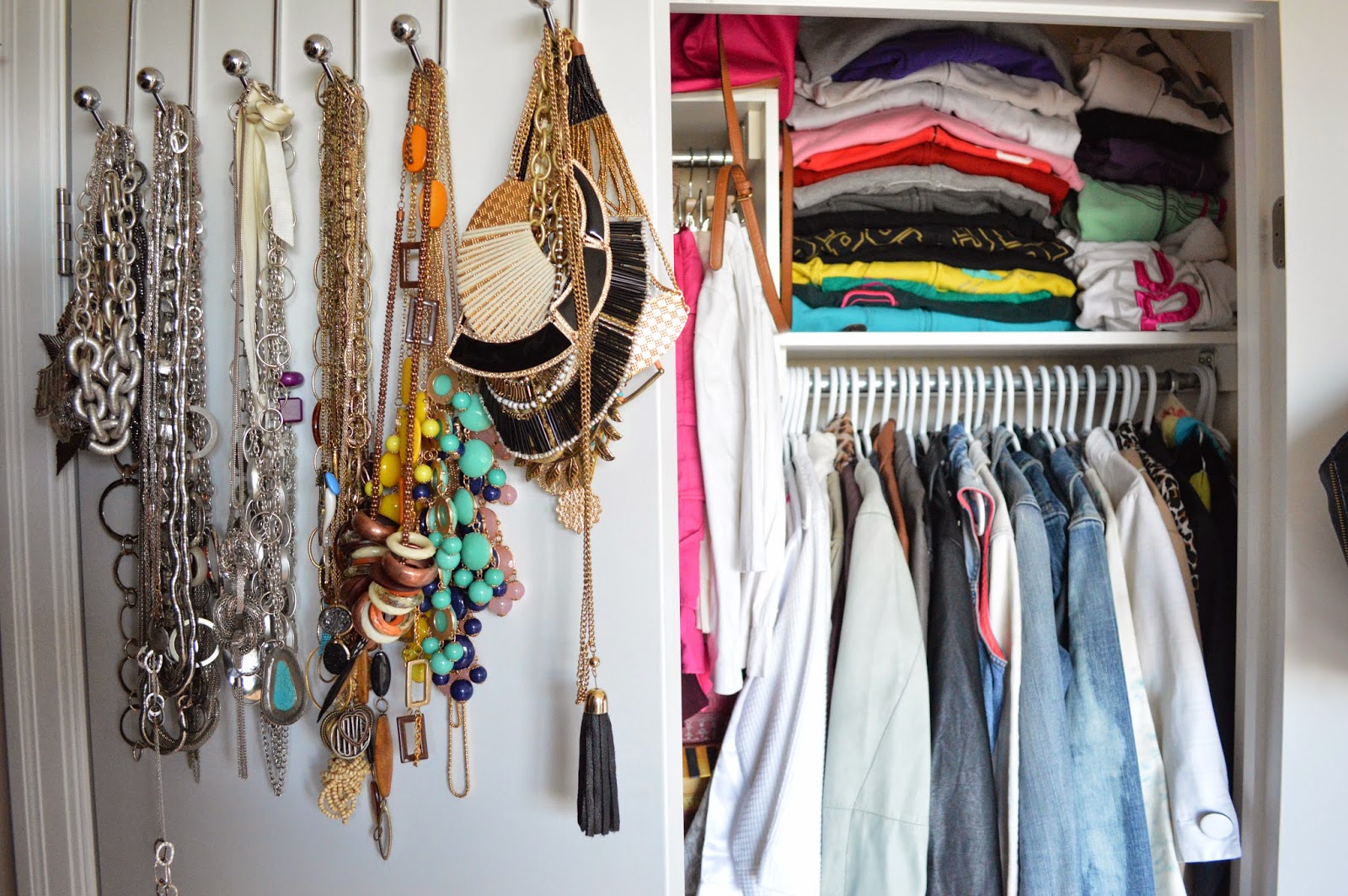 Behind one of the closet doors I’ve created a hidden storage solution for my necklaces with simple towel hooks from Dollarama.