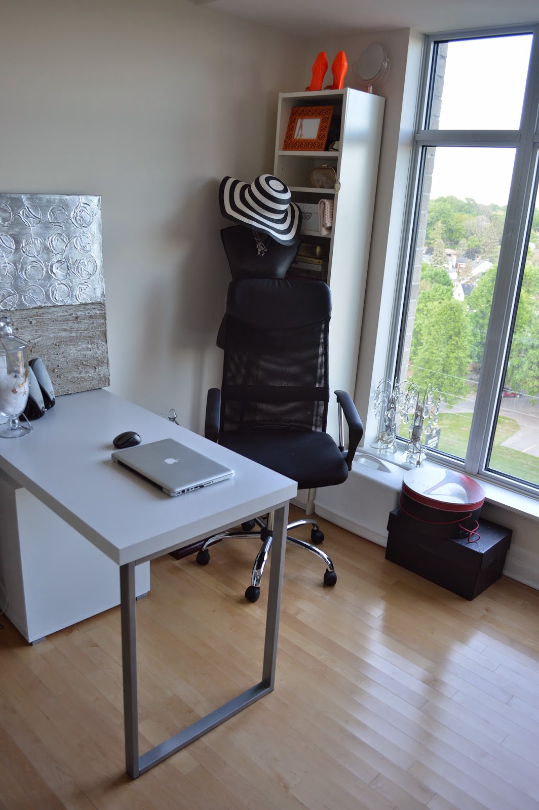 On the other side of the room, I purchased a simple white desk so I would have somewhere to work from instead of the dining room table, which has been my blogging, editing and sewing spot for the past few years.
