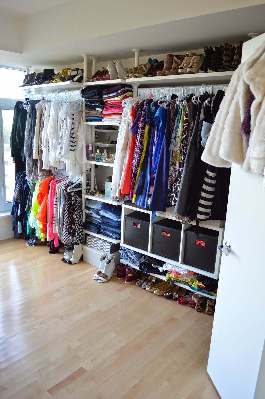 The whole closet is a customizable Stolmen system from Ikea, which can be removed and will be taken with us when we move to the next place. I knew I needed two bars for hanging tops, and one larger hanging area for dresses. We decided to get shelves and put them in the centre to store folded pants and various accessories that I can grab quickly in the morning while getting ready.