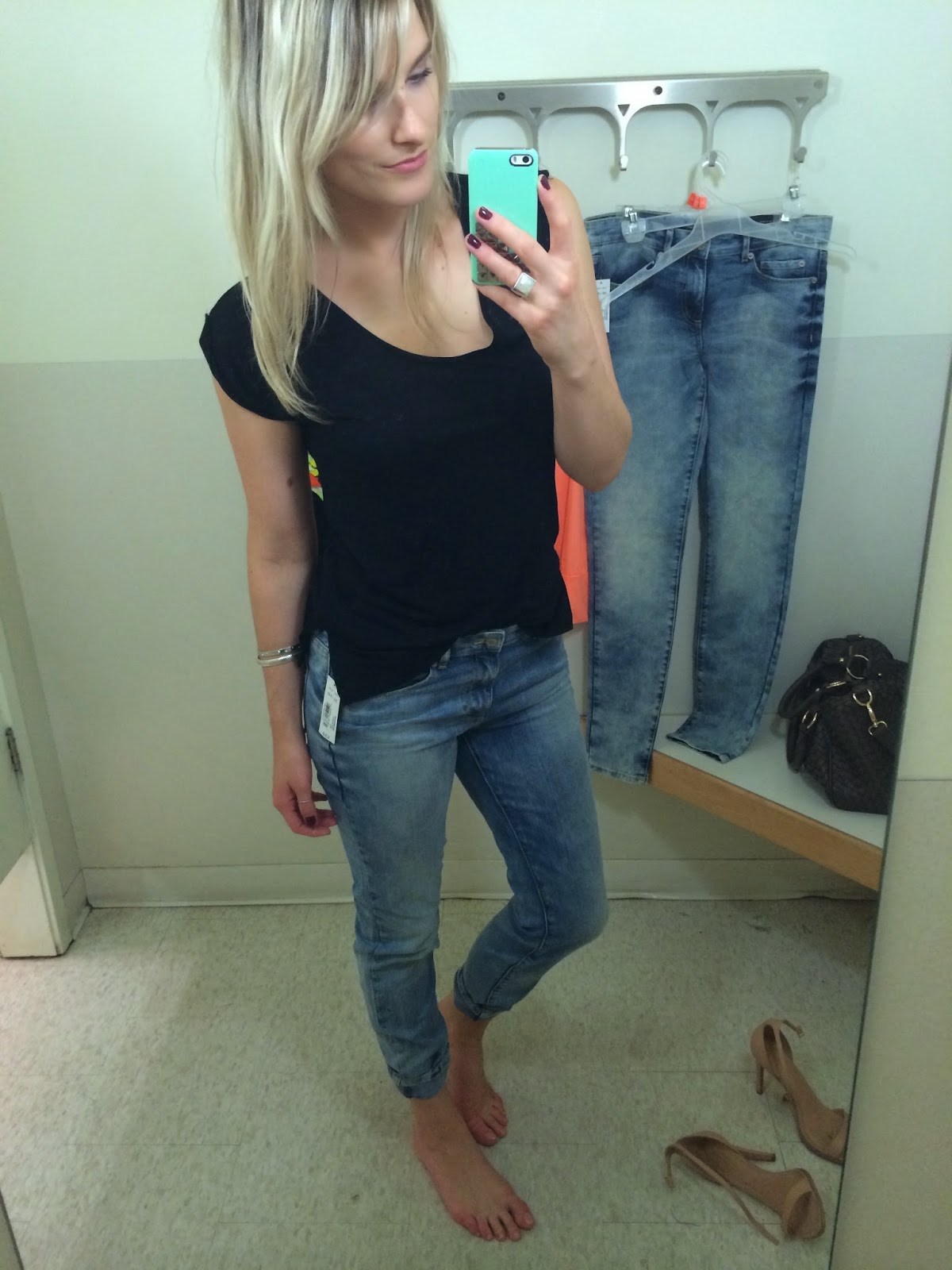 I wanted this sweater to work so badly but unfortunately they only had small and extra-small left (this is a small). It’s black and kind of thinly crocheted, and you would definitely need to wear a tank under it (unless you’re feeling bold for date night?) and was around $39, I believe. Not only is this pose awkward, the sweater is far too small but I wanted to share anyway because not everything we try on always looks good, right? Additionally, these are the size 30 jeans (my usual size, I’d say), which as mentioned above are not done up.