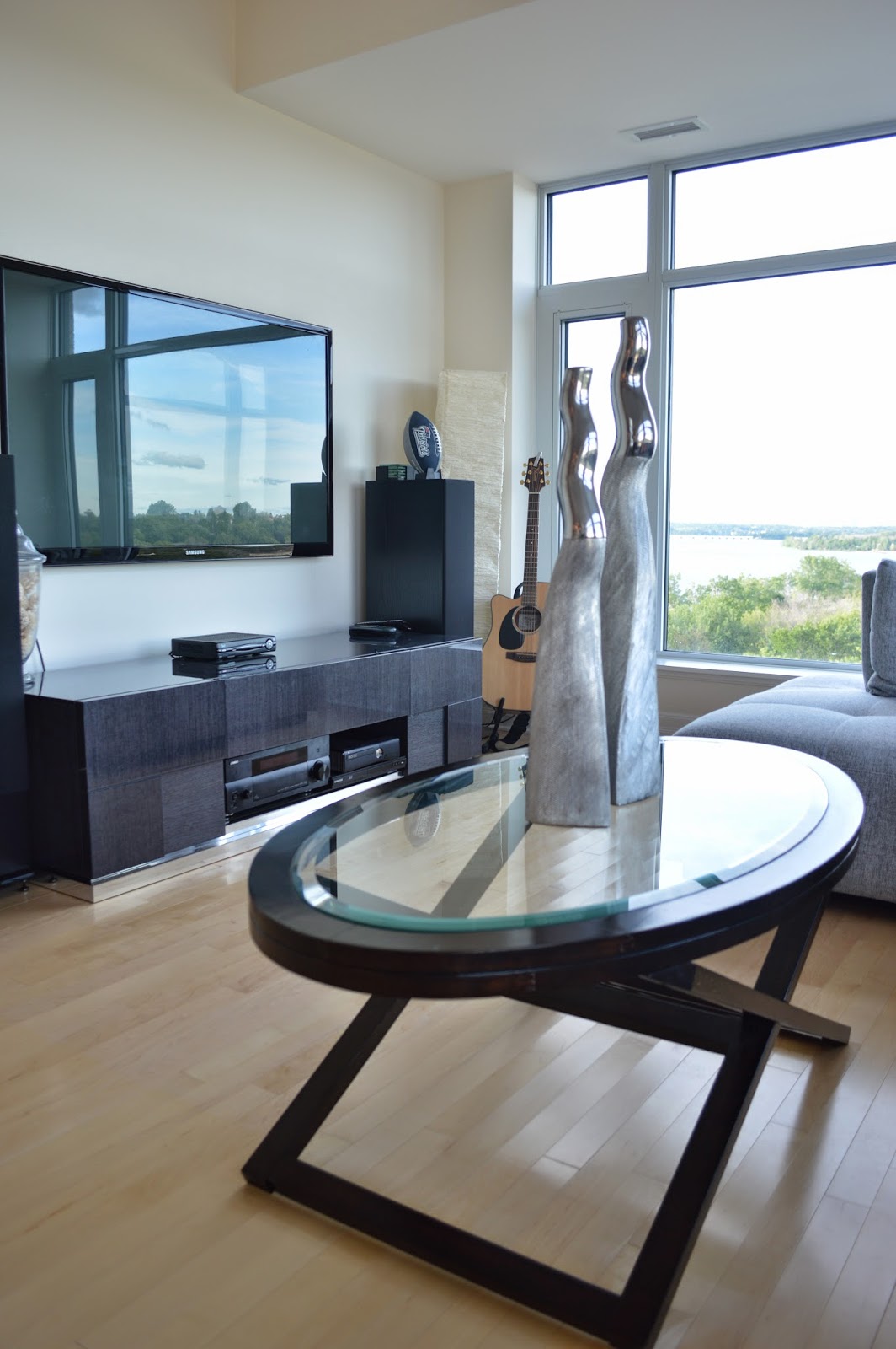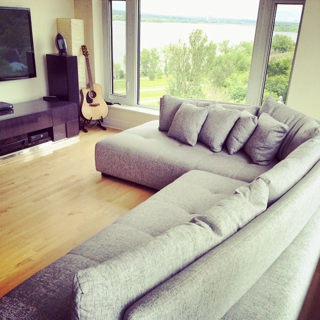 Couch from Mobilia | Coffee table (old) from Dufresne | Entertainment unit from Mobilia | Orange pillows & silver vases from Home Sense