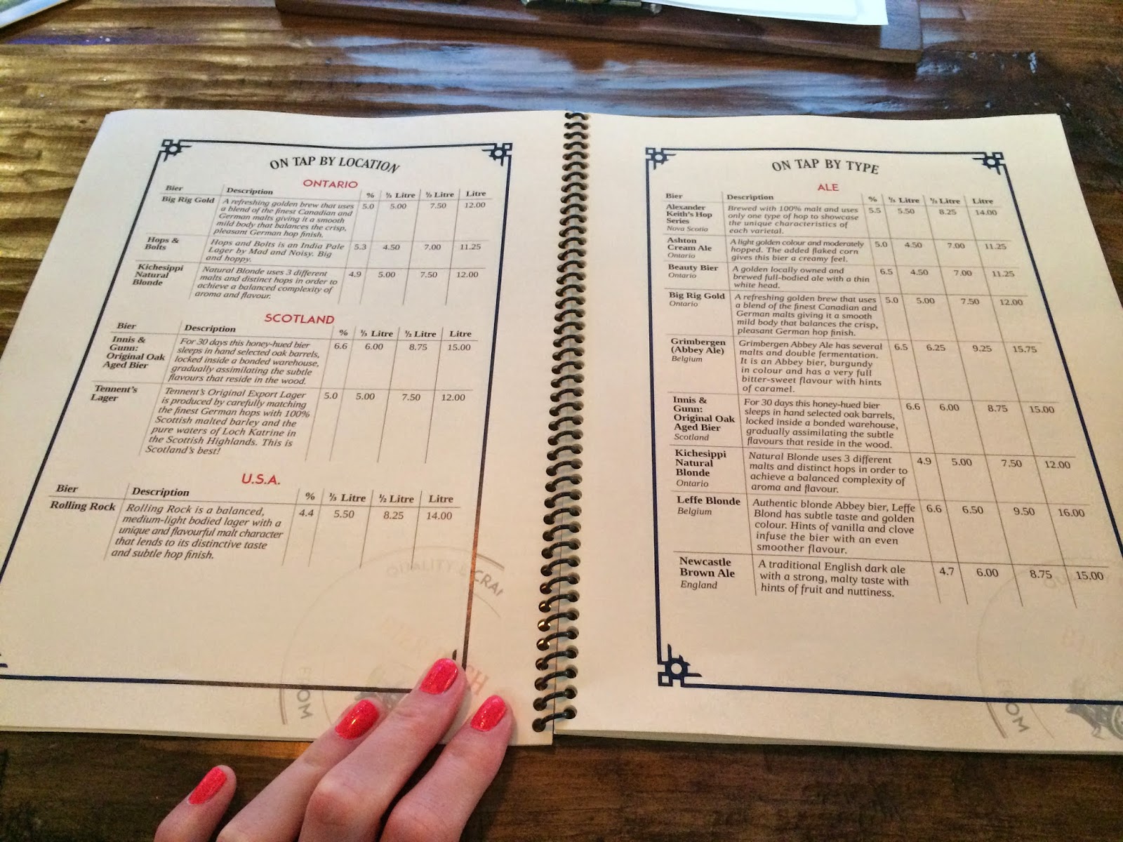 Our server greeted us and briefed us on the book–literally!–of beer selections and went off to grab us some water and allow us to get settled.