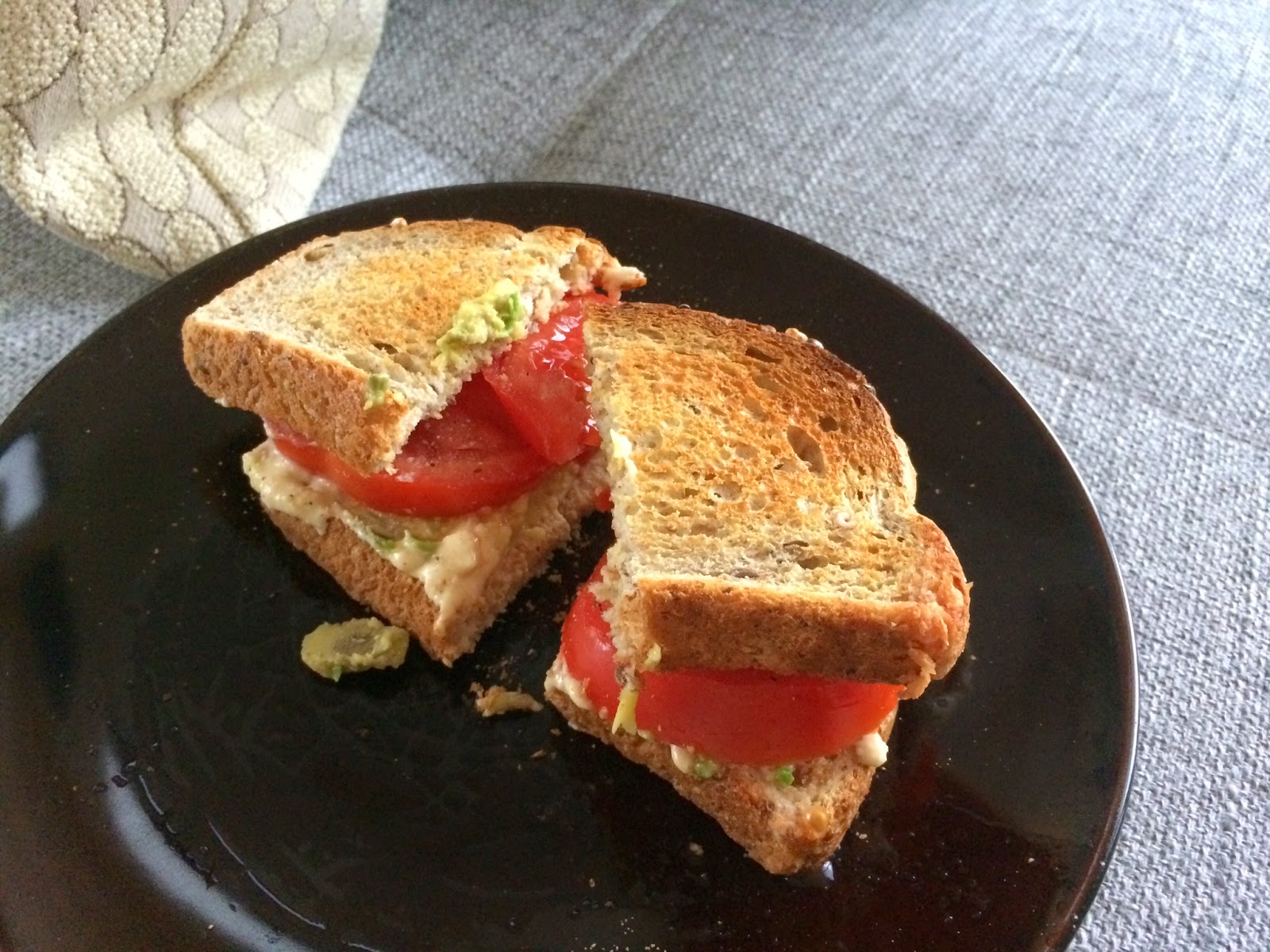 Too tired to cook, I came home and made myself a toasted tomato-avocado sandwich with hummus (non mayo). I try to stay away from bread, but I honestly really love it.