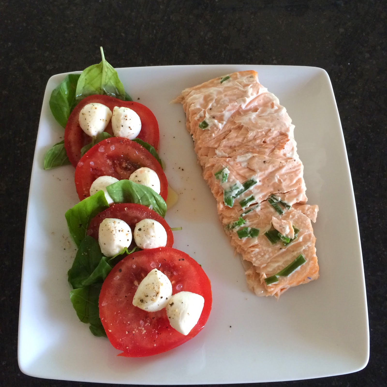 Caprese salad with baked salmon sprinkled with pepper, chives and a sprig of rosemary (we didn’t have dill).