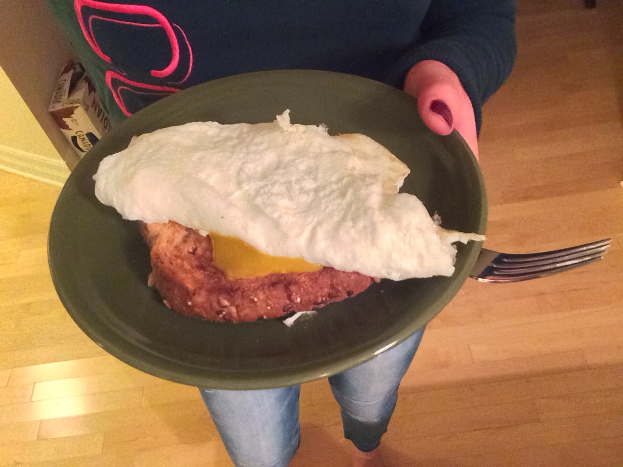 We were rushed to get to friends’ place so after my protein shake (I just arrived home from the gym) I fried two egg whites and one whole egg in some coconut oil and toasted a piece of Farm Boy multi-grain bread, and then…