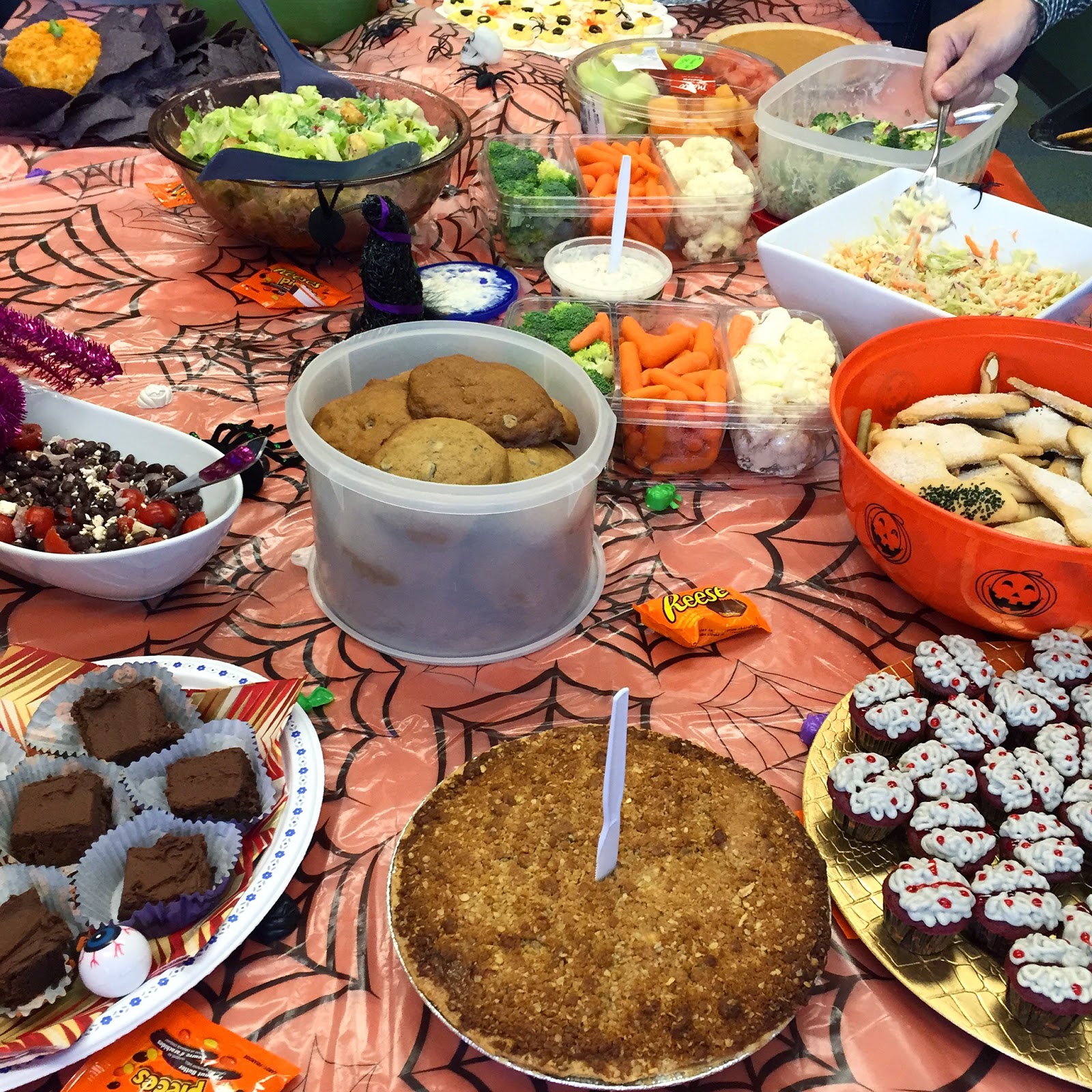 We had a huge potluck lunch at work which was delicious–so many great dishes brought in by everyone (I made a black bean salad). The downfall? Spilling sauce on my pink costume shirt! #soclumsy