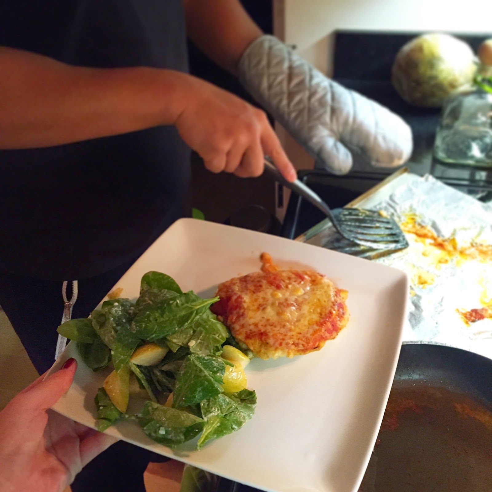 Marco whipped up chicken parm for dinner and I made a side spinach salad with pears.