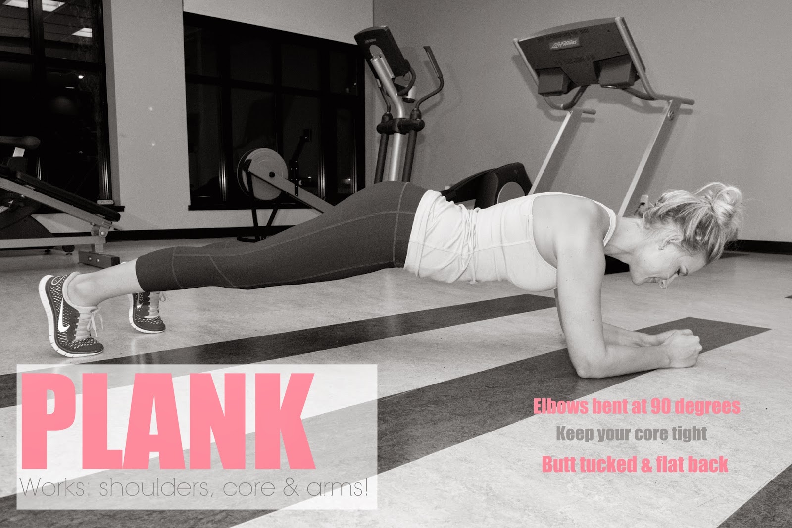 Planks are my nemesis! They are so brutal, yet are really a total body workout. I often do these in between sets to ‘super set’ my workout (i.e. keep the heart rate up). Set the timer on your phone and set a goal. For me, it’s at least one minute, but you can do more or less and work your way up.