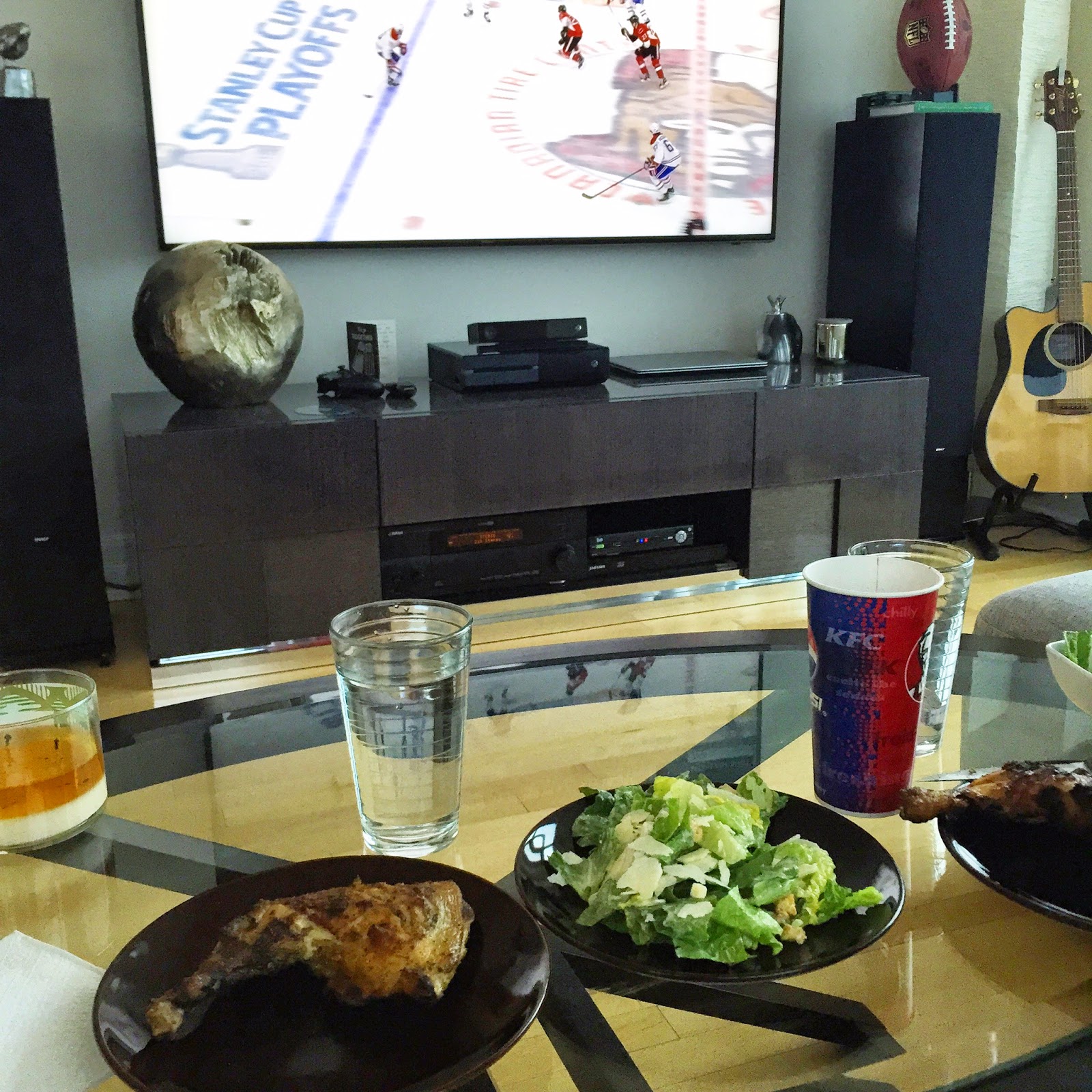 Sunday afternoon was spent finishing filming, spending a couple hours with a girlfriend and cheering on the Sens in the playoffs over BBQ chicken and caesar salads.
