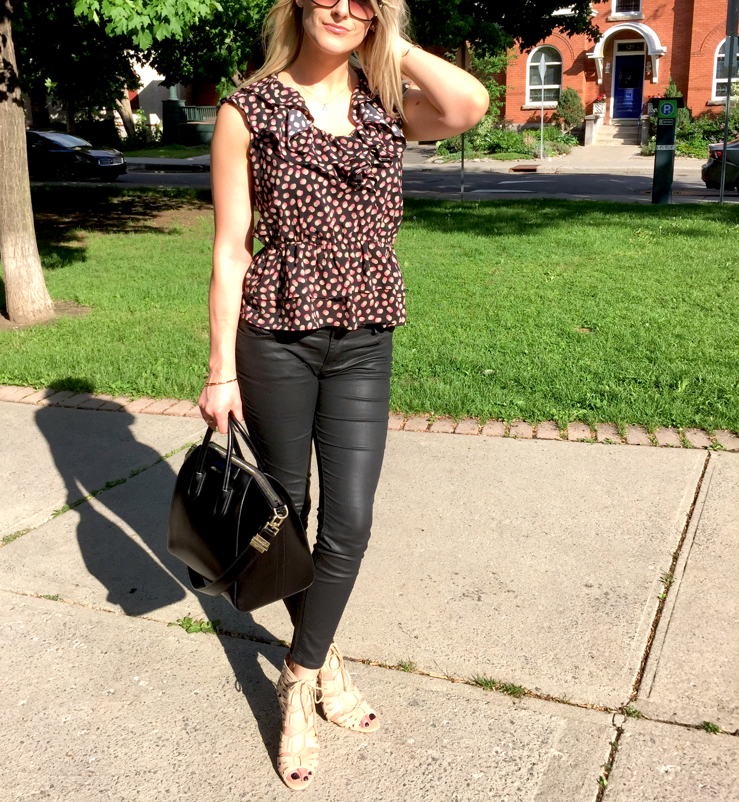 O U T F I T D E E T S : SUZY SHIER PRINTED TOP – OLD (SIMILAR, LOVE THIS) | WAXED PANTS (LOVE THESE, COLOURED) | LACE-UP HEELS ON SALE | BAG | SUNGLASSES (BUDGET FRIENDLY) | NECKLACE