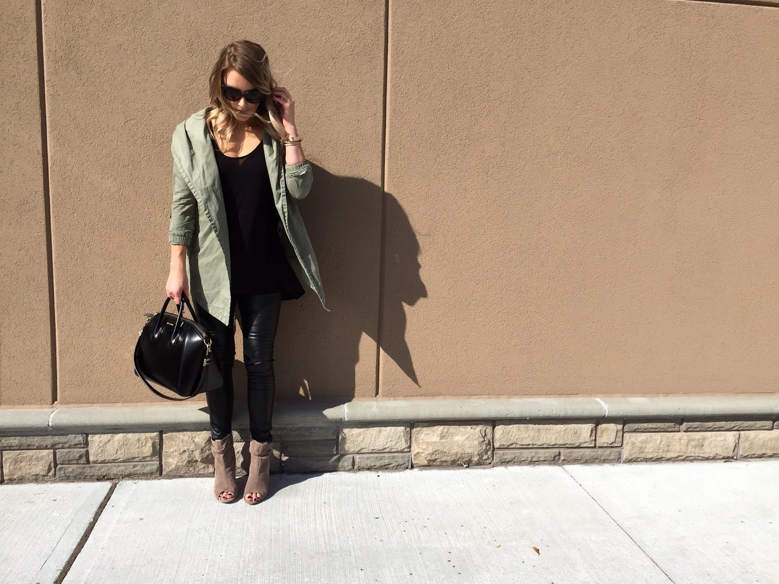 The faux leather leggings and the cotton top–which is chiffon in the back–adds a little something extra. A large, black knit scarf would be a great complimentary piece to add, or a sweater if it’s cooler. From there, you can add in more black or a few colour pieces like I did with the jacket and suede booties.