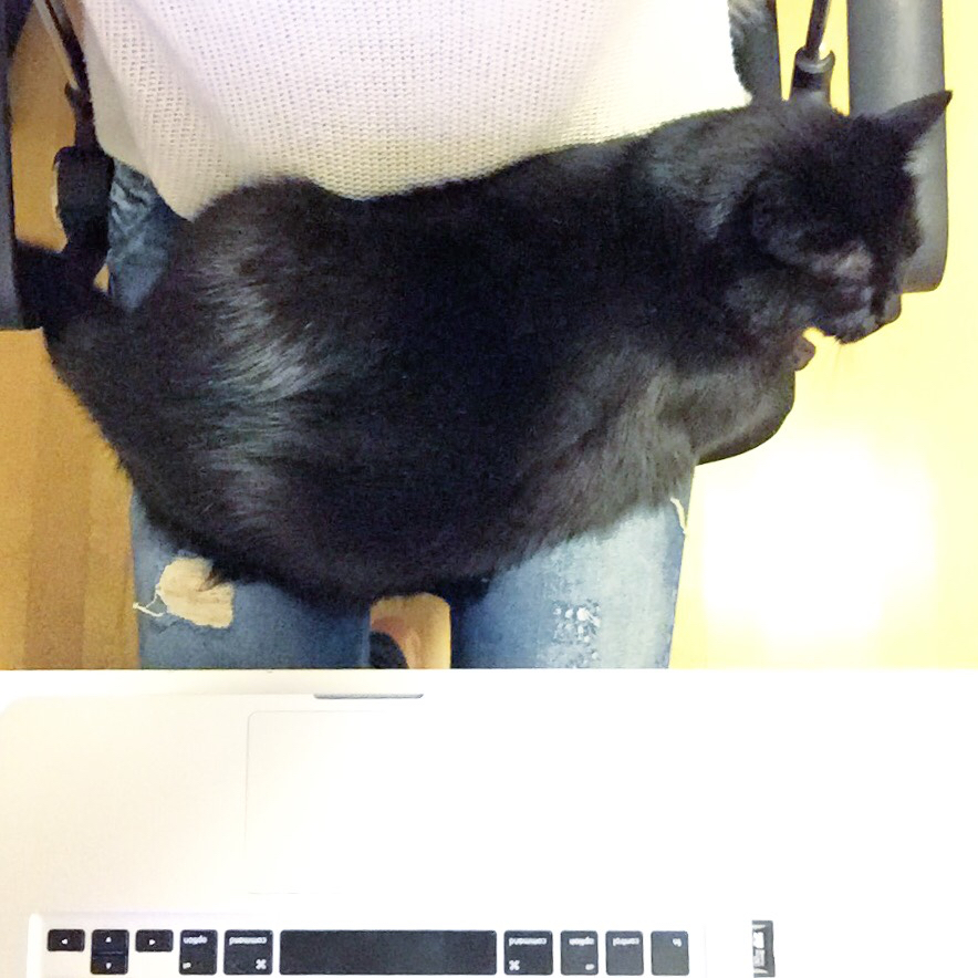 Back home, getting some work done on the computer with this little girl in tow–she always hangs around and I love having her perch up on me while I work (or watch endless YouTube videos).