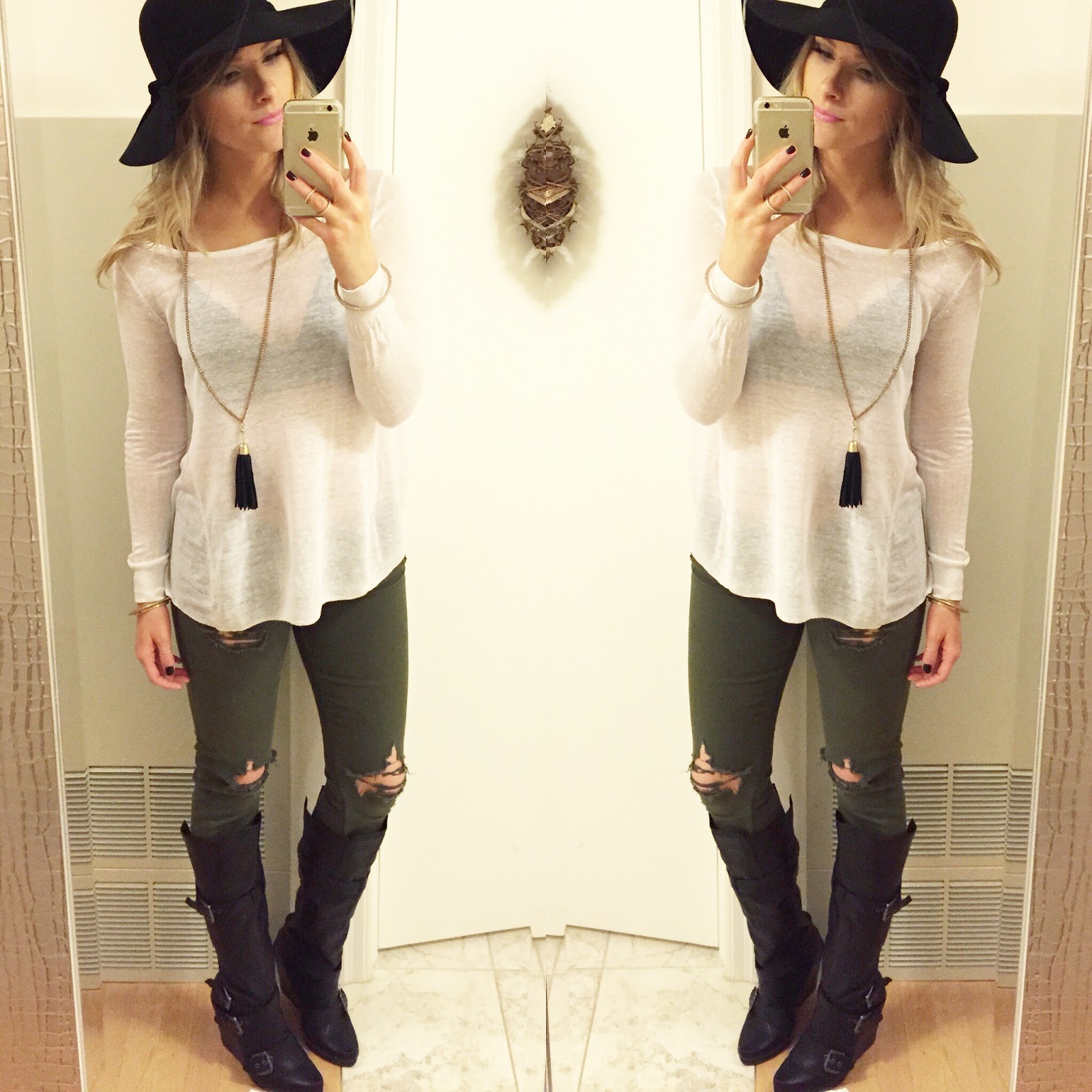 HAT | WINNERS SWEATER (SIMILAR) | BRALETTE | SKINNIES | ALDO BOOTS – OLD (SIMILAR) | NECKLACE