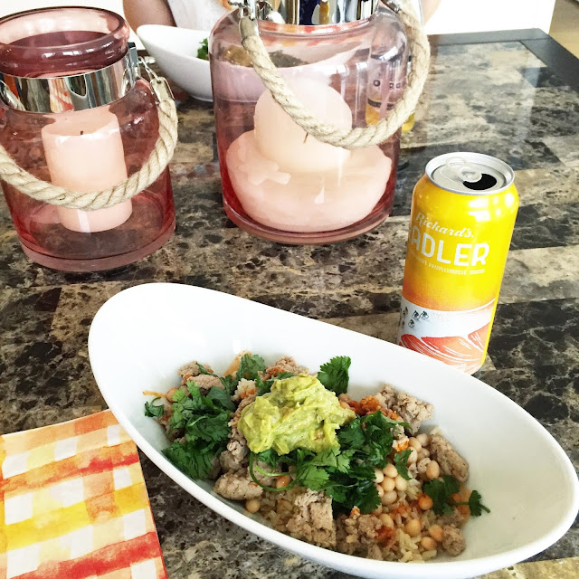 I spent the afternoon cleaning the condo, doing laundry and around dinner time, my girl friend came over and I made us Mexican rice bowls. I’m obsessed with this new dish, it’s brown rice, topped with ground turkey, navy and black beans, cilantro, hot sauce and a scoop of guacamole. So. Good.