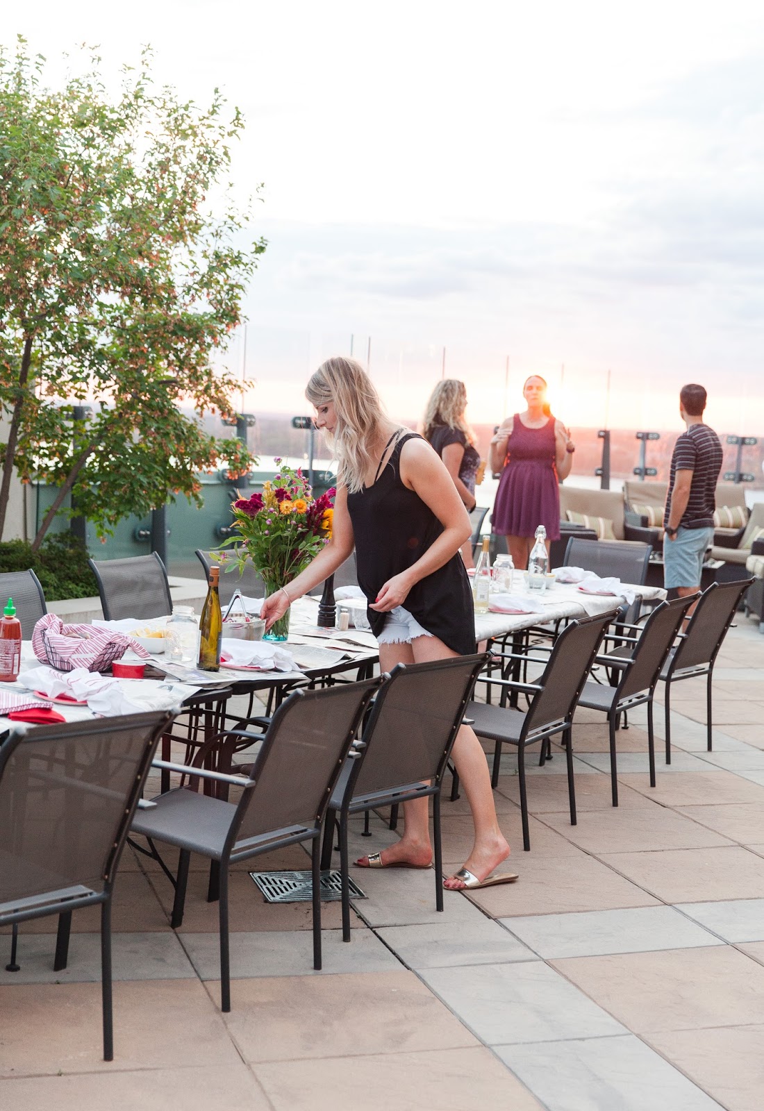 First things first, cut the flowers, set the table and pour the wine. I used newspapers as an inexpensive way to dress the table, but also for easy clean up afterwards. It was a little windy on the rooftop, so we ended up having to tape it down!