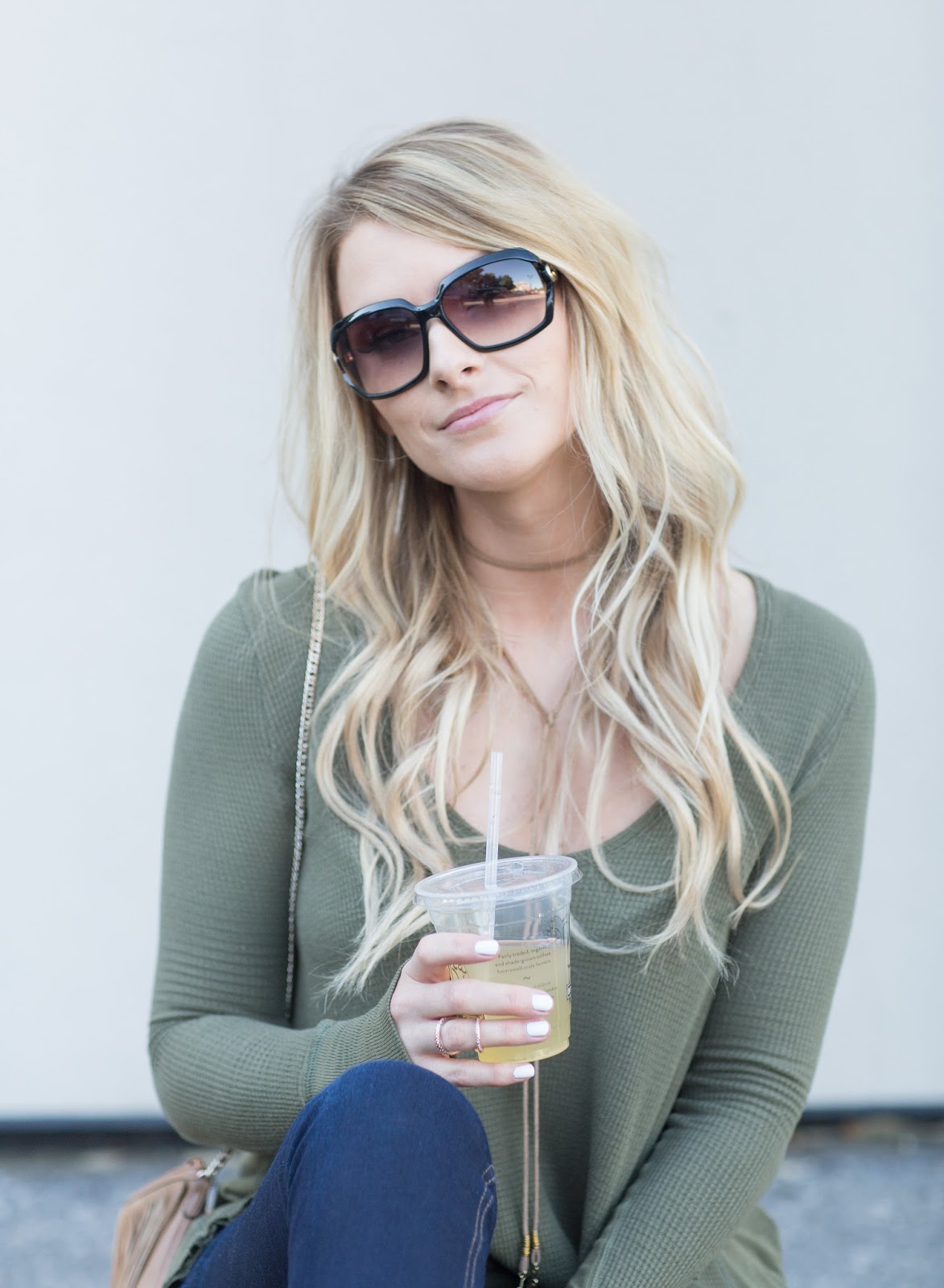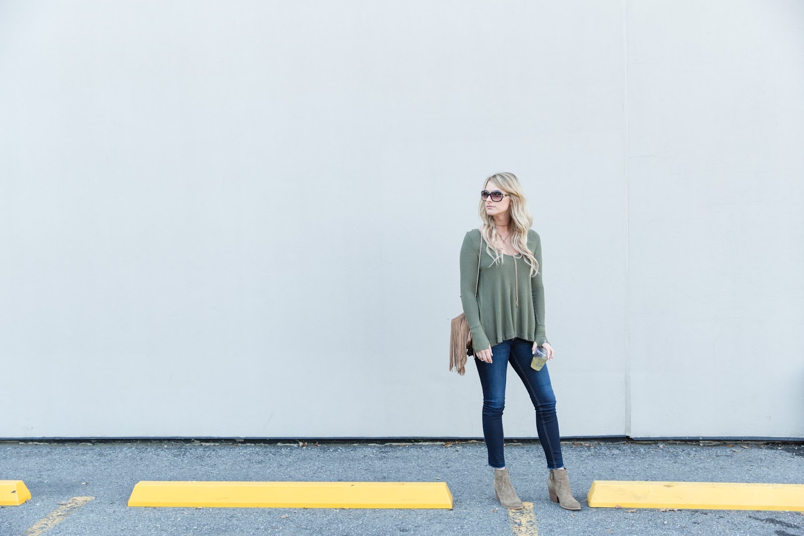 are my go-to, and since purchasing the black and cream colours in the Spring, I knew I had to splurge on this olive coloured one that came out this fall. I know they are a little pricey, but the fit is amazing (size down), they are uber comfortable, wash well and I wear mine all the time. Additionally, they are a great layering piece and believe me when I say, you will get your money’s worth.