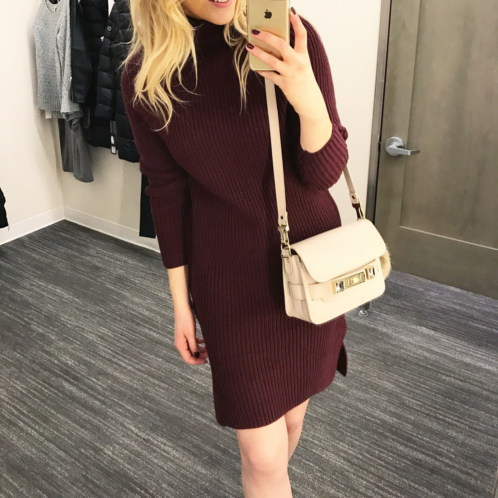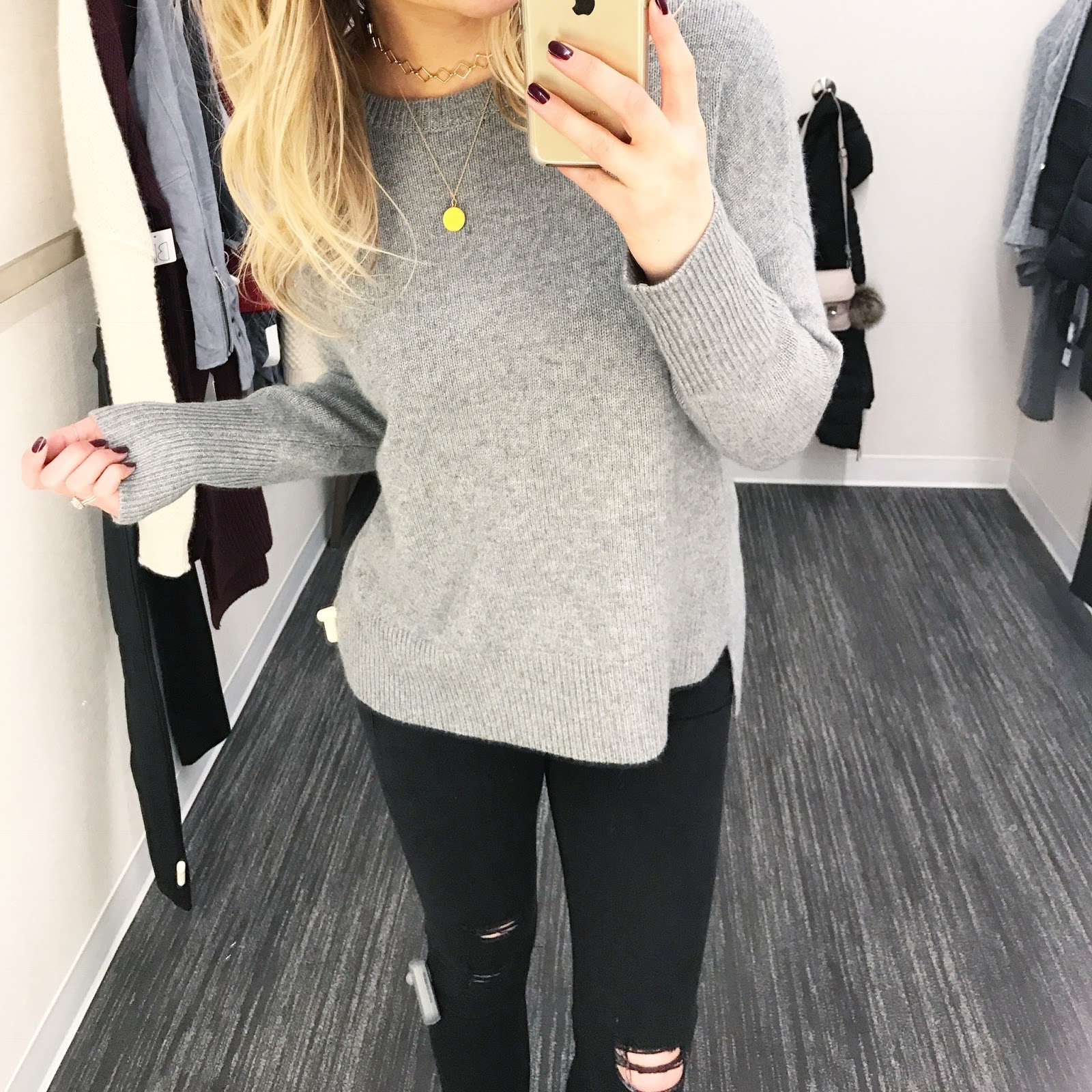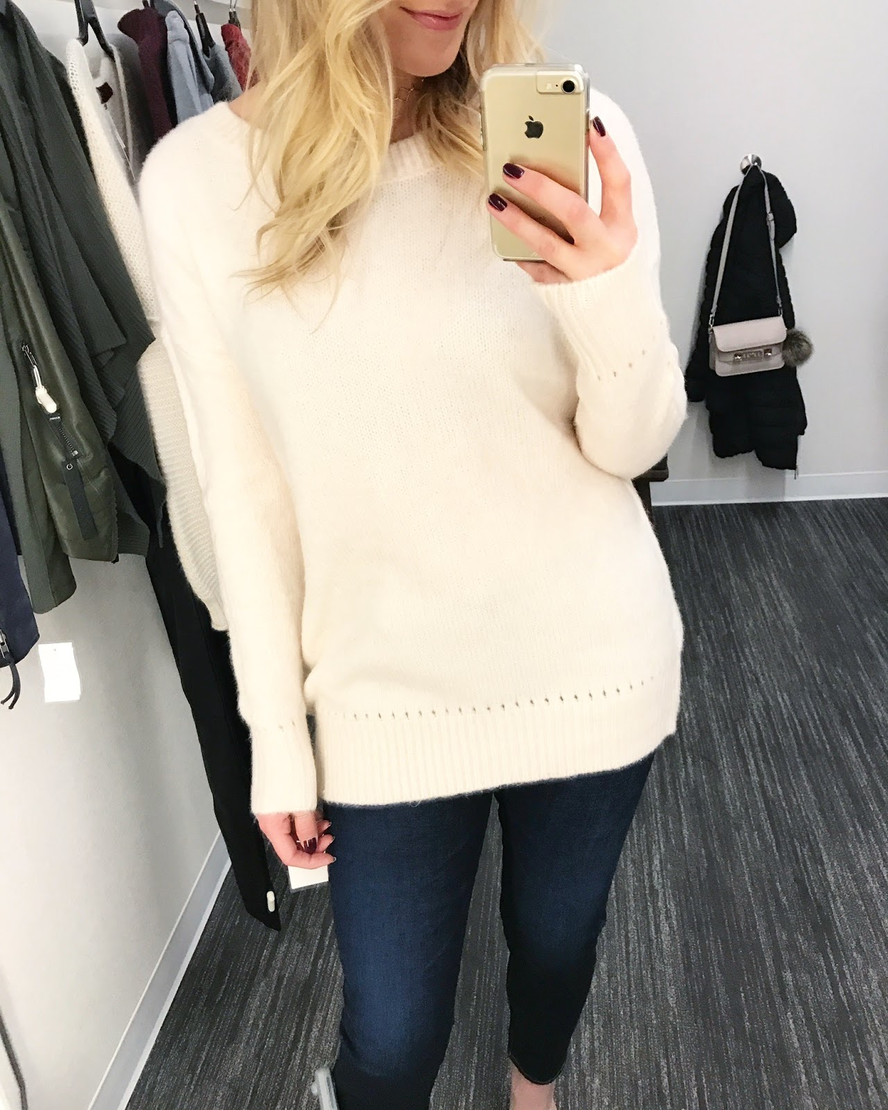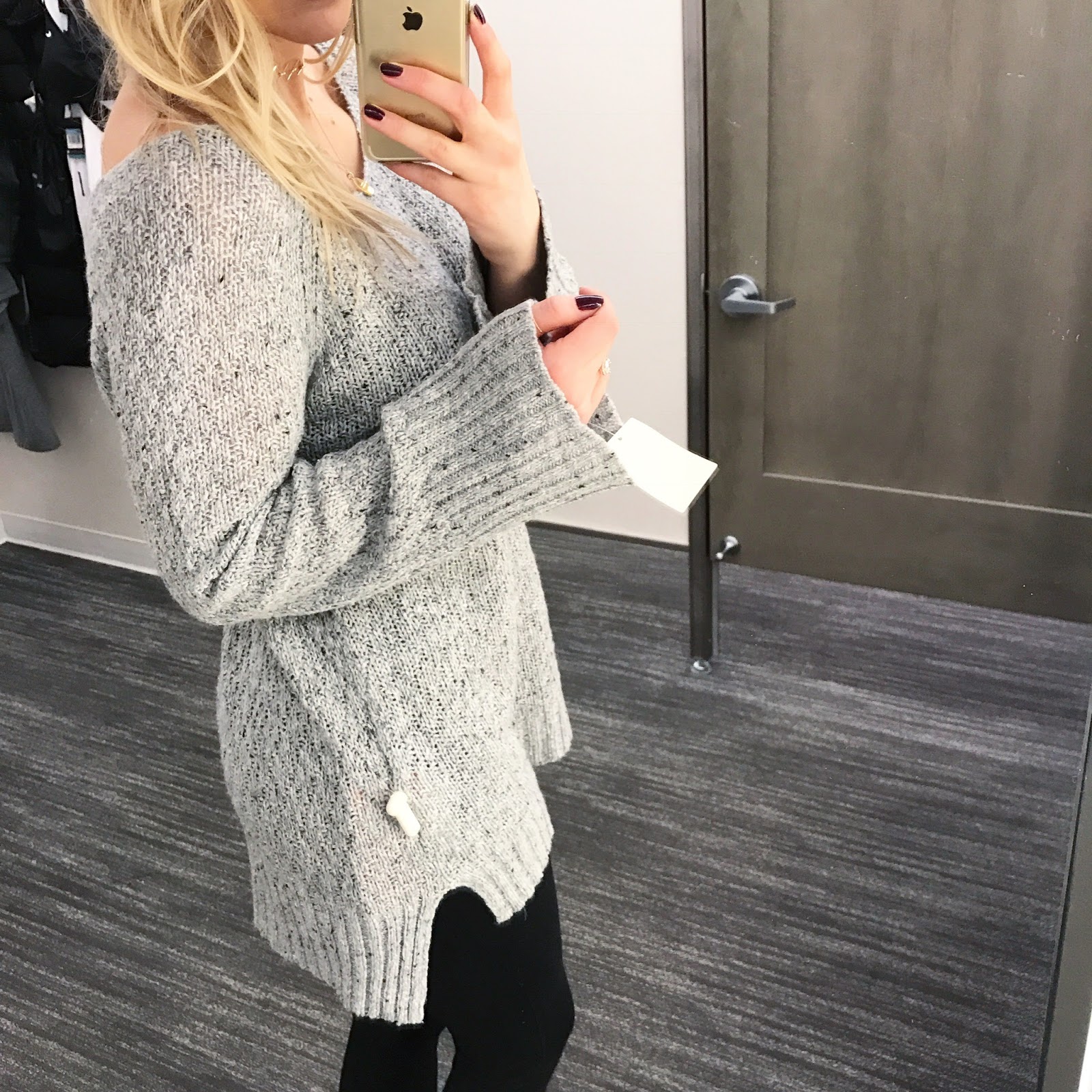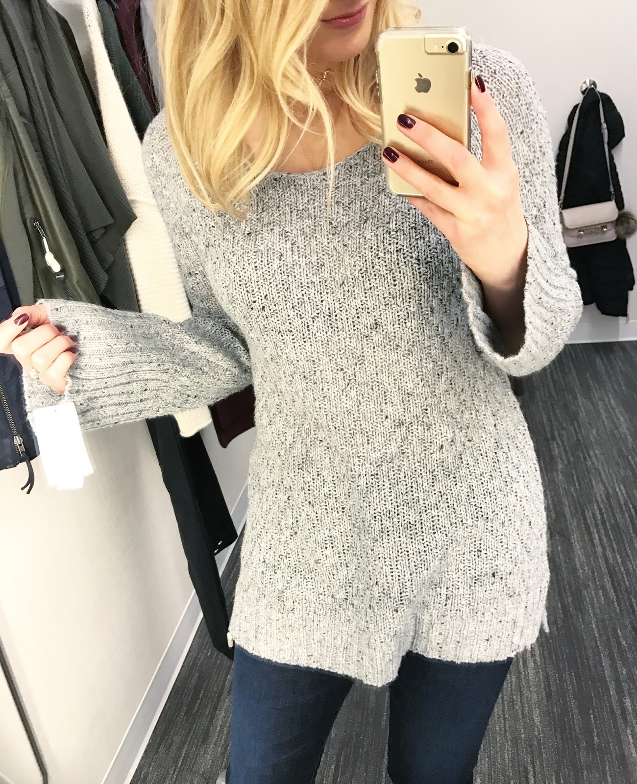 I have been eyeing this sweater for a while, and while it’s not part of the sale, I wanted to try it on. I’m wearing a small and the sleeves are a 3/4–however, on the model they are full length. I would probably go with a medium, although the body fit well in this, they just didn’t have one.