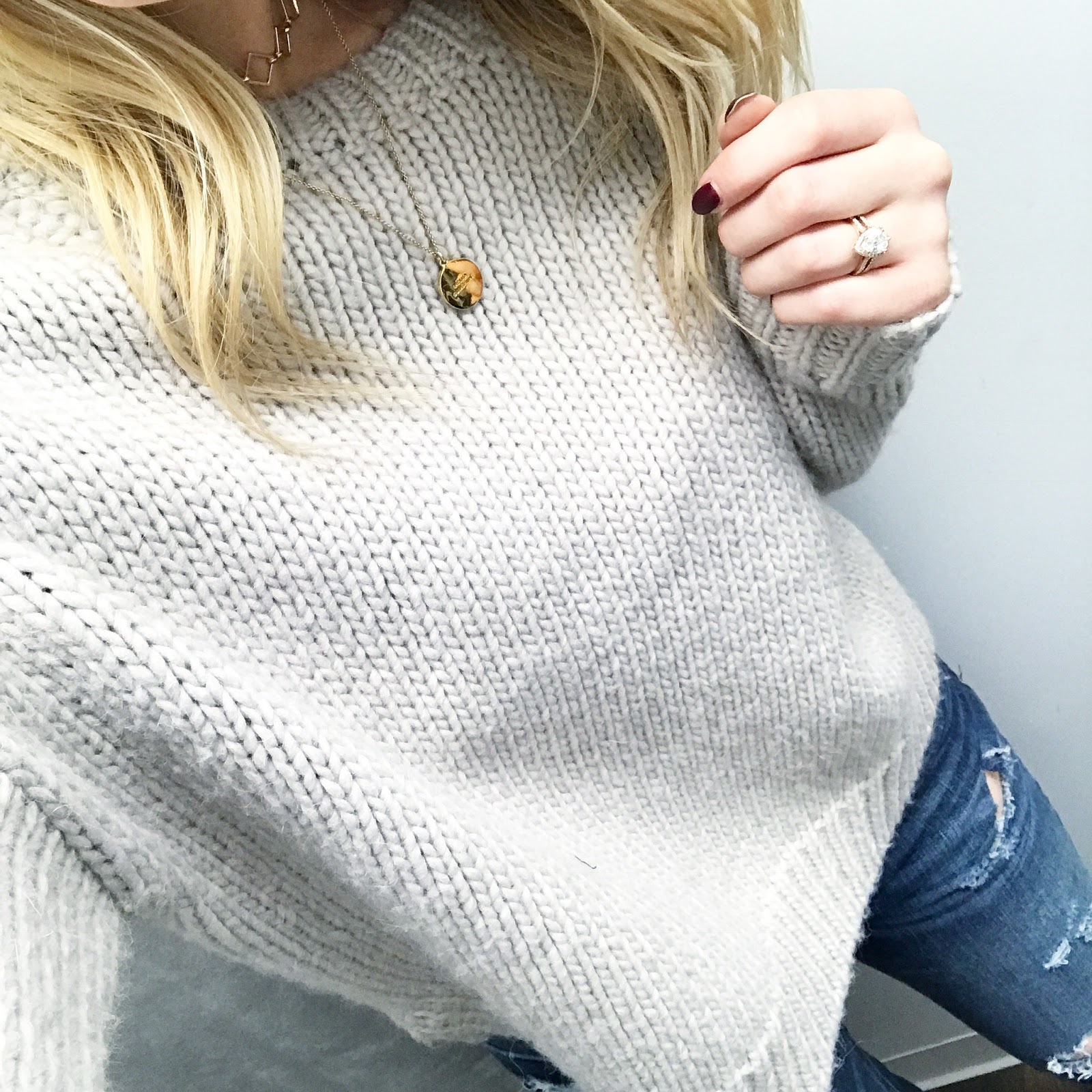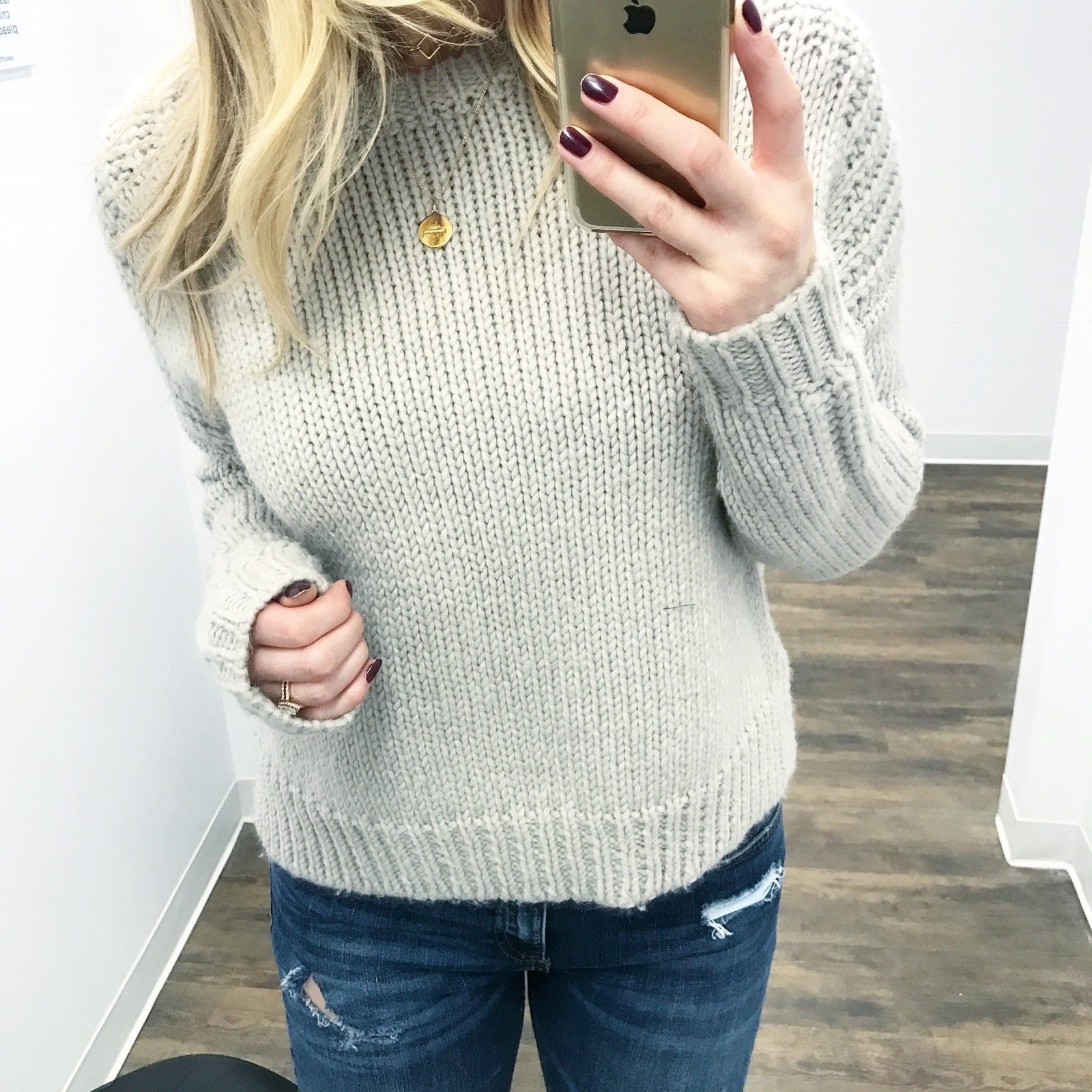 I am in love with this heavy knit sweater! I’ve been eyeing it for several months so when I saw it marked down over 50%, I had to scoop it up! The sleeves are extra long on this one, it’s so cozy, and fits true to size. You can definitely tell it’s a well made piece and something I will have for a long time. I could also see myself pairing underneath to add a layer for interest.