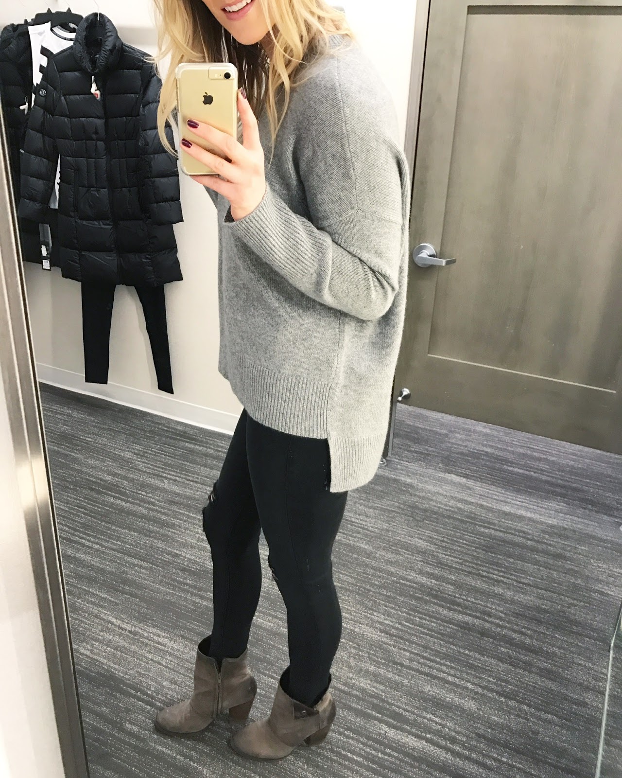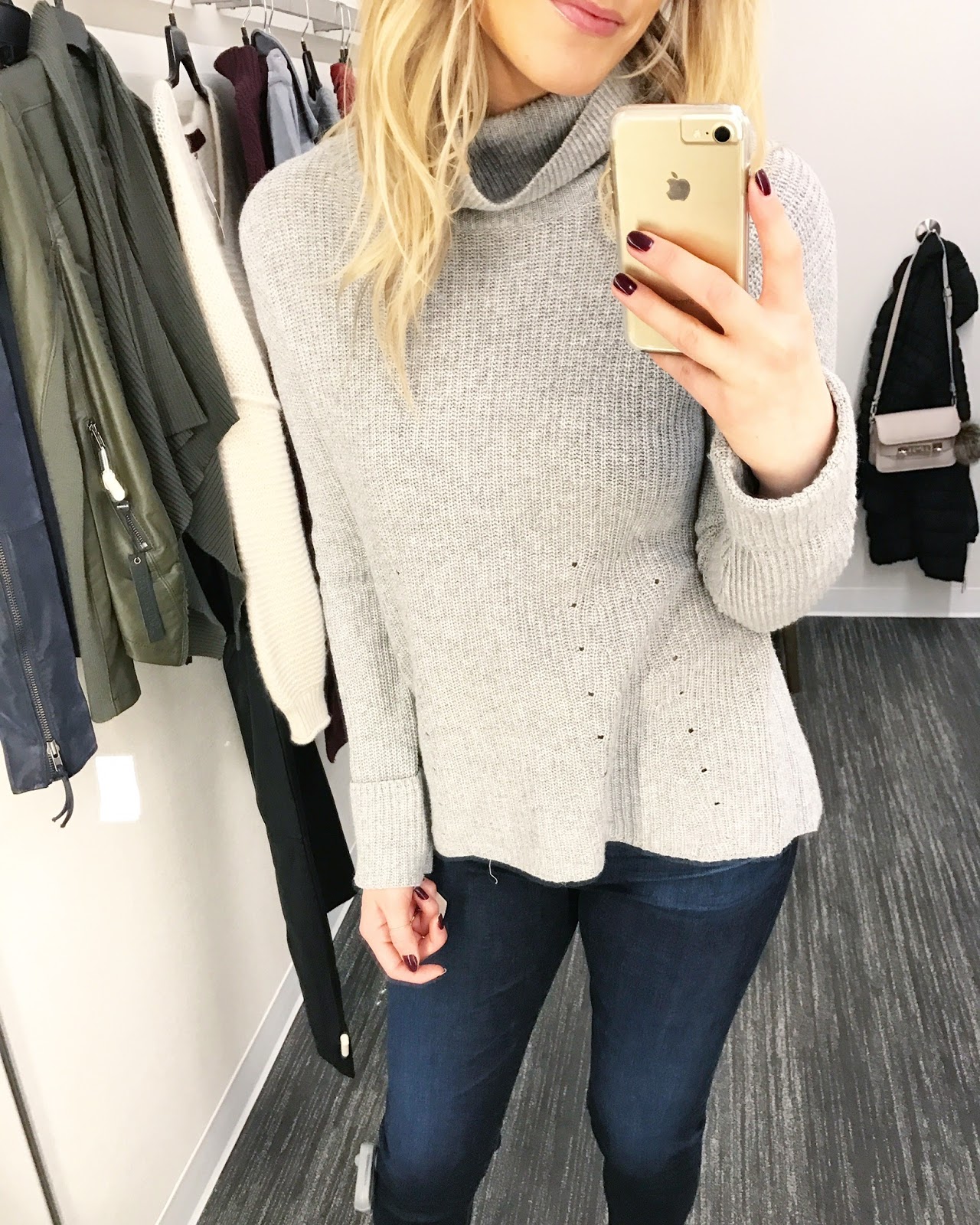 This grey knit turtleneck was super cute and has a hi-low hemline so might work with leggings for my shorter girls. The sleeves have a sewn rolled cuff and it fits true to size (I’m wearing a medium).