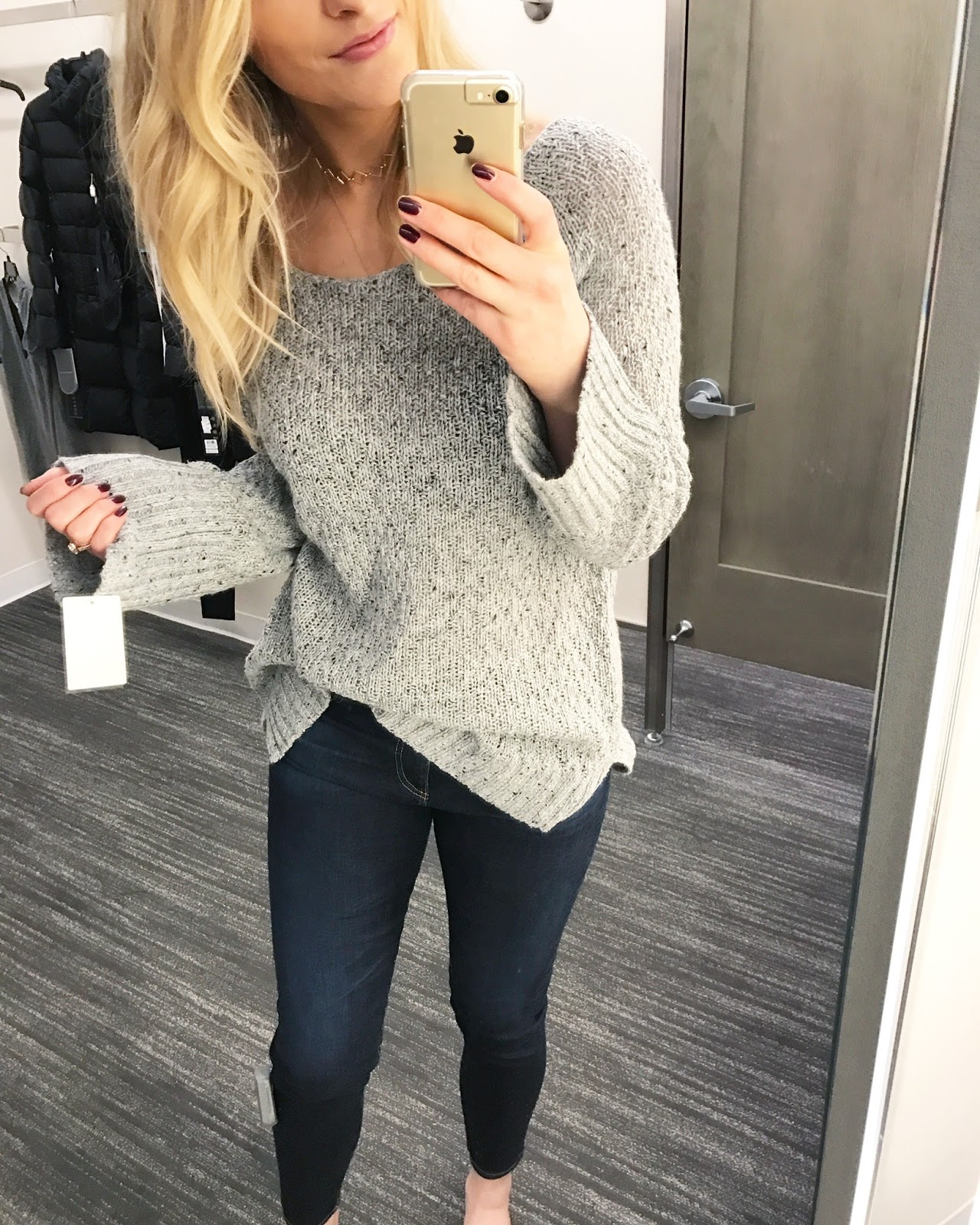 This open knit sweater is pretty, and I love the bell sleeves. Free People always runs big, so I’m wearing a medium and was swimming. I ended up passing on it, just because I already have two, grey bell sleeved sweaters.