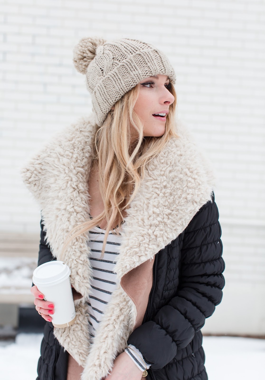 O U T F I T D E T A I L S : PARKA FROM ITALY (, ) | SHEARLING VEST — OLD (, ) | POM HAT — OLD () | GARAGE STRIPED TOP () | | LEGGINGS | () | ()