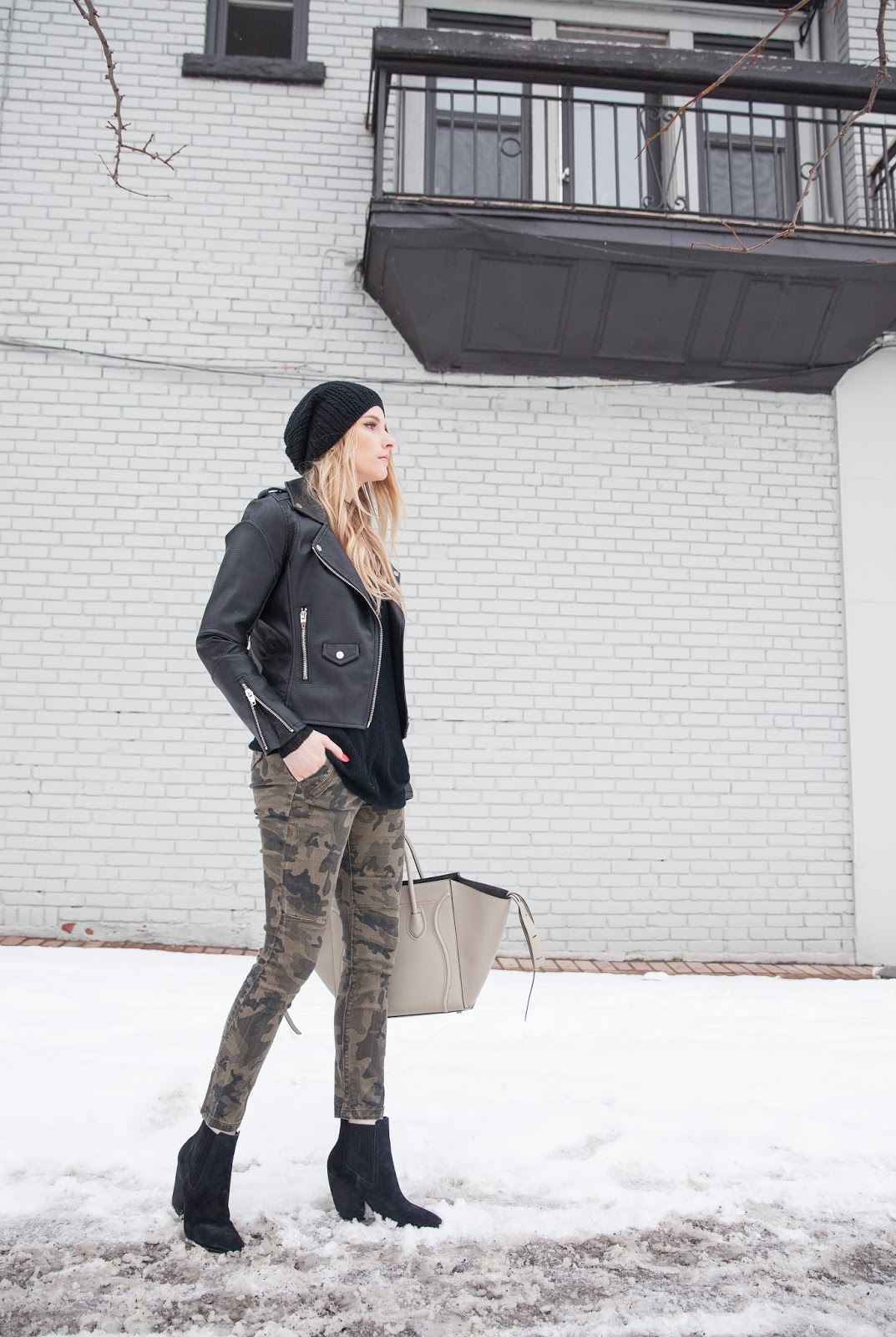 This look is the second look recently with camo pants () and made it really simple by layering on various black elements; lace cami, open knit sweater, leather jacket & beanie. Super simple, and would work out as the weather starts to warm up as well–although, admittedly, I’d lose the beanie by then.